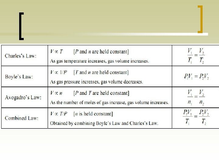 Combined Gas Law n Combining Boyle’s Law with Charles’s Law ¡ P 1 V 1 / T 1 = P 2 V 2 / T 2