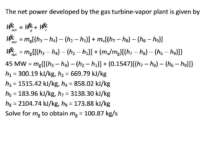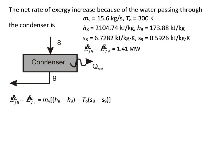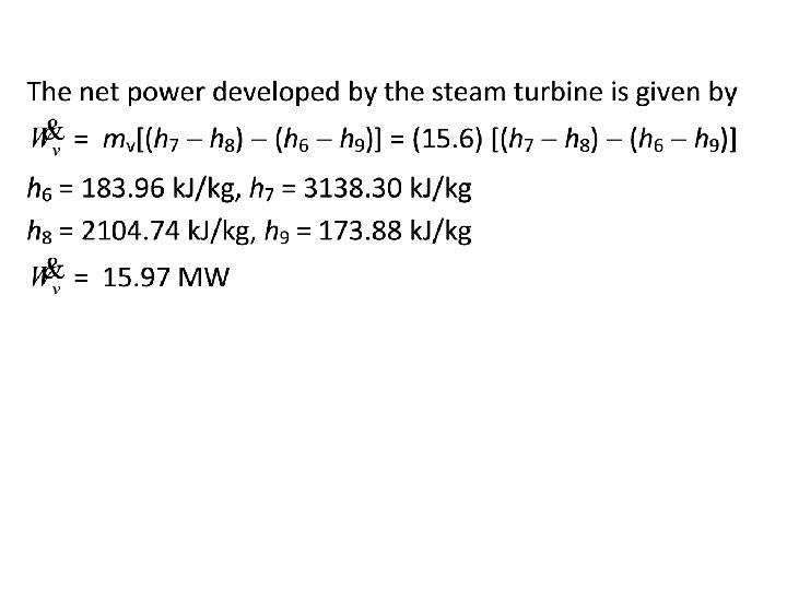 State 7: T 7 = 400 o. C, p 7 = 8 MPa From steam table or CATT 2 program (Computer Aided Thermodynamic Tables 2) h 7 = 3138. 3 k. J/kg, s 7 = 6. 3633 k. J/kg K Isentropic expansion to state 8, p 8 = 8 k. Pa h 8, isen = 1989. 9 k. J/kg h 8 = h 7 + 0. 90*(h 8, isen h 7) = 3138. 3 + 0. 90*(1989. 9 3138. 3) h 8 = 2104. 7 k. J/kg State 9: Saturated liquid at 8 k. Pa: h 9 = 173. 86 k. J/kg, s 9 = 0. 59254 k. J/kg K