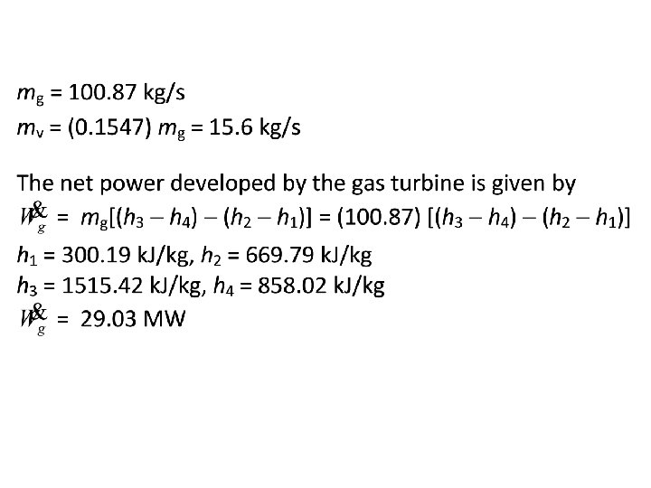 State 3: T 3 = 1400 K h 3 = 1515. 42 k. J/kg, pr 3 = 450. 5 State 4: p = 100 k. Pa Adiabatic expansion from 1, 200 k. Pa to 100 kpa From Table A-22 pr = 37. 35, h = 767. 29 k. J/kg pr = 39. 27, h = 778. 18 k. J/kg h 4, isen = 767. 29 + (37. 5417 37. 35)*(778. 18 767. 29)/(39. 27 37. 35) h 4, isen = 768. 3773 k. J/kg h 4 = h 3 + 0. 88*(h 4, isen h 3) = 1515. 42 + 0. 88*(768. 3773 1515. 42) h 4 = 858. 0224 k. J/kg