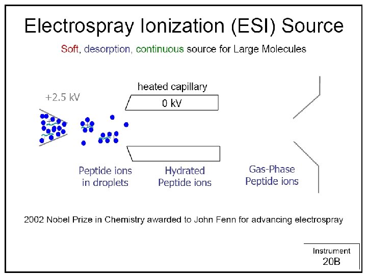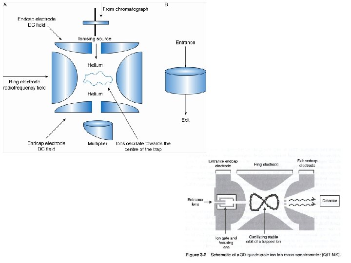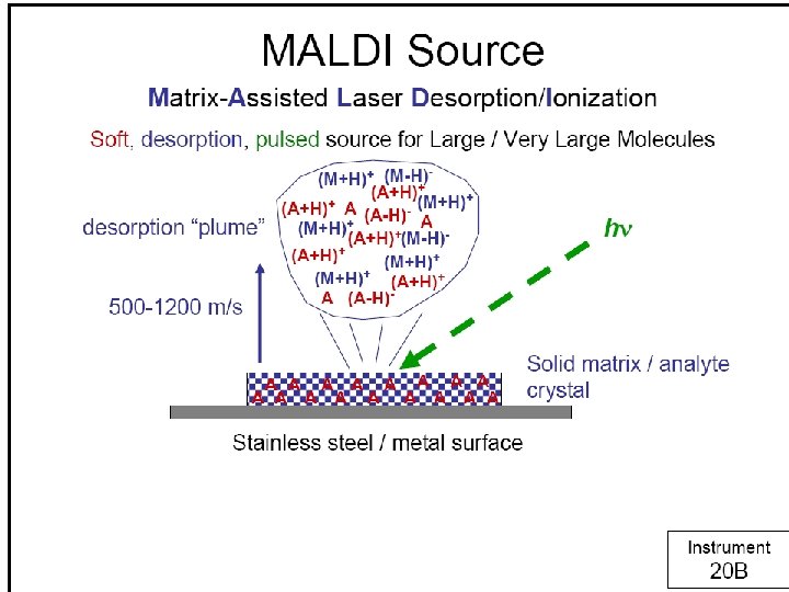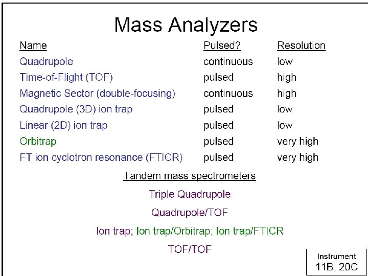 Magnetic Sector analyzers • KE = z e. V = ½ mv 2 – V potential difference between A and B – ze is the charge of the ion – v velocity of the ion after acceleration • FM= Bzev – FM magnetic force – B magnetic field strength • • Fc = mv 2/r Fc balancing centripetal force Bzev = mv 2/r m/z = B 2 r 2 e/2 V