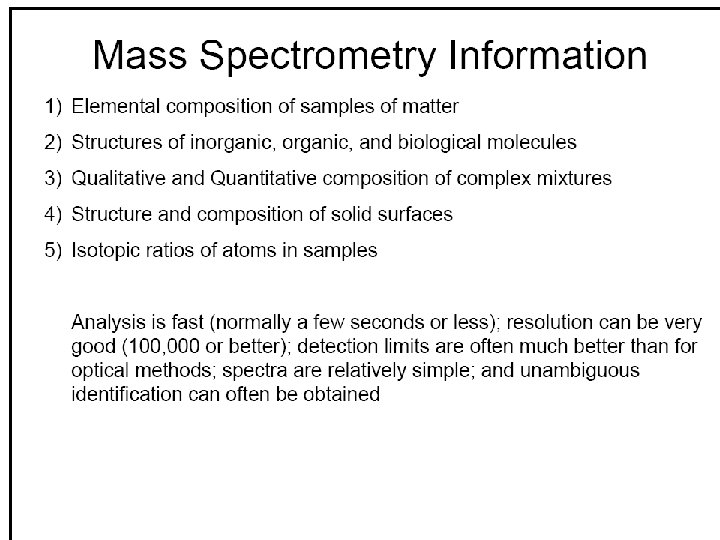 Applications of Molecular Mass Spectrometry • • • Elucidation of structure of organic and biological molecules Determination of molecular weight of peptides and oligonuclutides Identification of components of thin layer and paper chromatography Determination of sequences of amino acids in of polypeptides and proteins Detection and identification of species separated by chromatography and capillary electrophoresis Identification of drugs of abuse and metabolites of drugs of abuse in blood, urine, and salvia Monitoring of gases in patient’s breath during surgery Testing for the presence of drugs in blood of thoroughbred racing horses and Olympic athletes Dating of archeological specimens Analyses of aerosol particles Determination of pesticide residues in food Monitoring of volatile organic species in water supplies