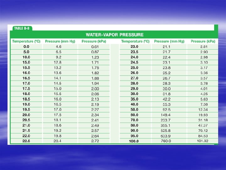 § Hydrogen gas is collected over water at 20. 0 ºC. The partial pressure of hydrogen is determined to be 742. 5 torr. What is the barometric pressure at the time the gas was collected? § P atm = P gas + P water § P atm = 742. 5 torr + 17. 5 torr (found in table B-8 in book p R 79, make sure in correct units) § P atm= 760. 0 torr