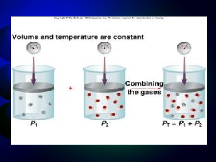 Dalton’s Law of Partial Pressure • The total pressure of a system is the sum of the partial pressures of all the gases that make up the system. • Ptot = P 1 + P 2 + P 3 + … – Where Ptot is the total pressure – P 1 is the pressure of gas 1 – P 2 is the pressure of gas 2 – P 3 is the pressure of gas 3