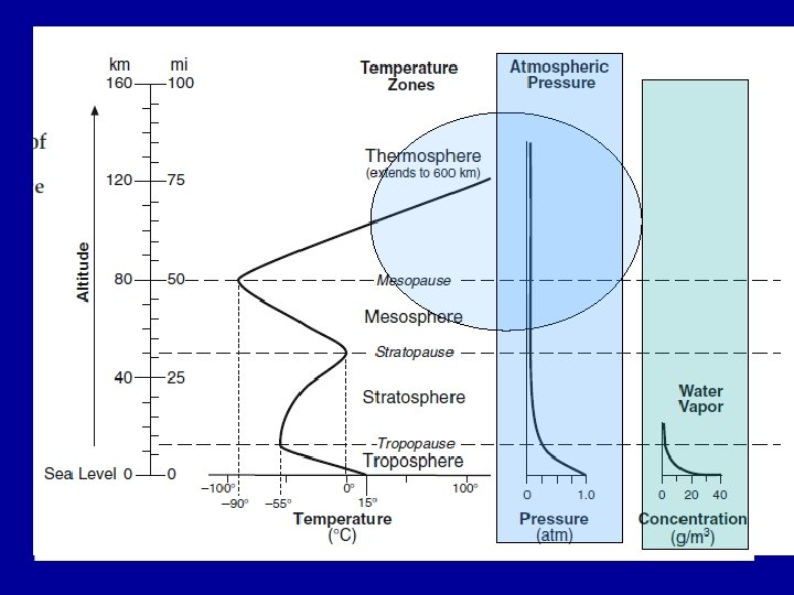 The Atmosphere • The amount of nitrogen and oxygen need to stay fixed, or relatively stable humans couldn’t survive. • The amount of water vapor is constantly changing…(one reason we have weather!) • There are 4 main layers to the atmosphere: • 1. Troposphere (we live here, weather occurs) • 2. Stratosphere (ozone is here) • 3. Mesosphere (rocks from space burn up) • 4. Thermosphere