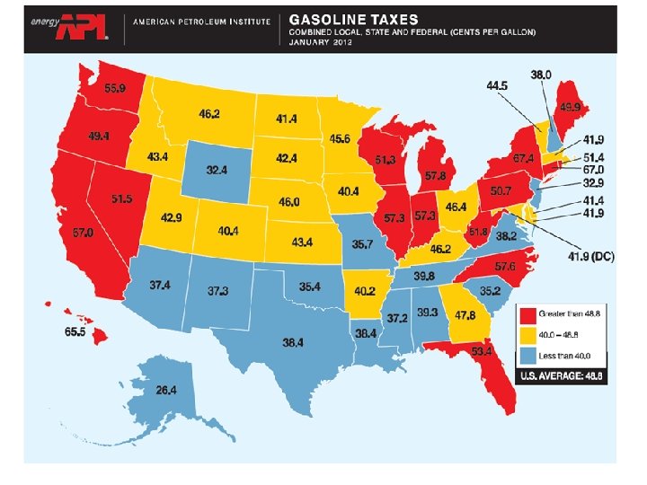 Gasoline taxes Federal Excise Tax, currently: 18. 4 cents per gallon Each state also has excise and other taxes including sales tax Combined State and Federal taxes are about 57. 3 cents per gallon in Illinois (one of the higher taxed states)