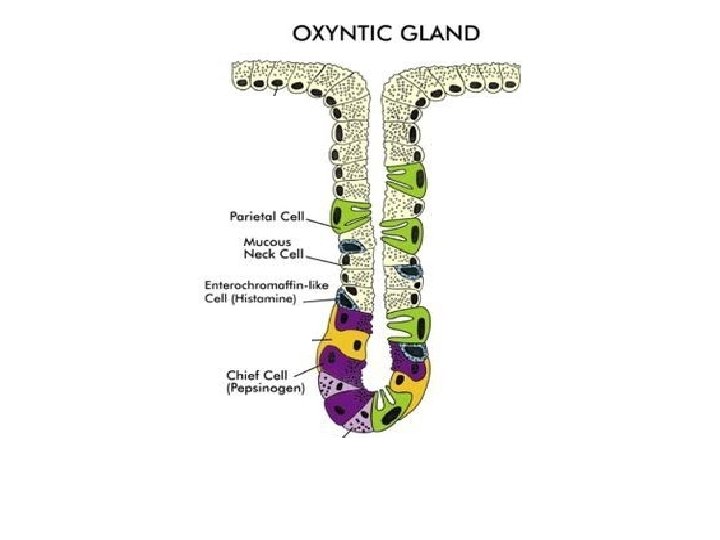 • • • MUCOUS SECRETING CELLS OXYNTIC/GASTRIC GLAND Line the entire surface of stomach PYLORIC GLAND In mucosa of antral portion of stomach In mucosa of fundus and body of stomach