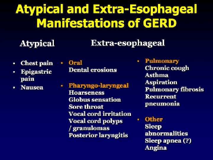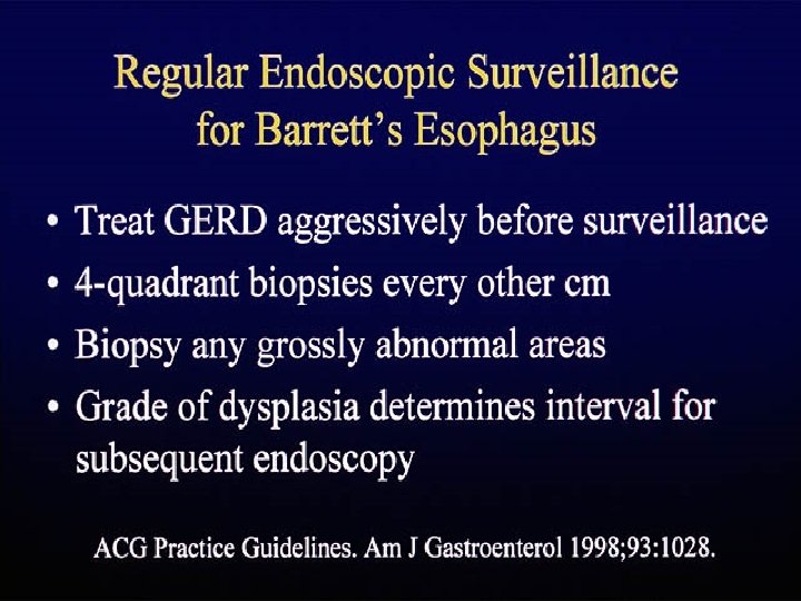 Prospective evaluation of referring Dyspeptics in Tehran • 269 (135 F) participant • Symptoms recorded, UGIE + Bx from Z-line was done: • 77. 6% at least one major GERD symptom • 76. 1% EE (most A & B) • 5% Specialized intestinal metaplasia • 3 Dysplasia • None of the symptoms could predict the endoscopic or histologic findings • Nasseri-Moghaddam, Malekzadeh et al 2002