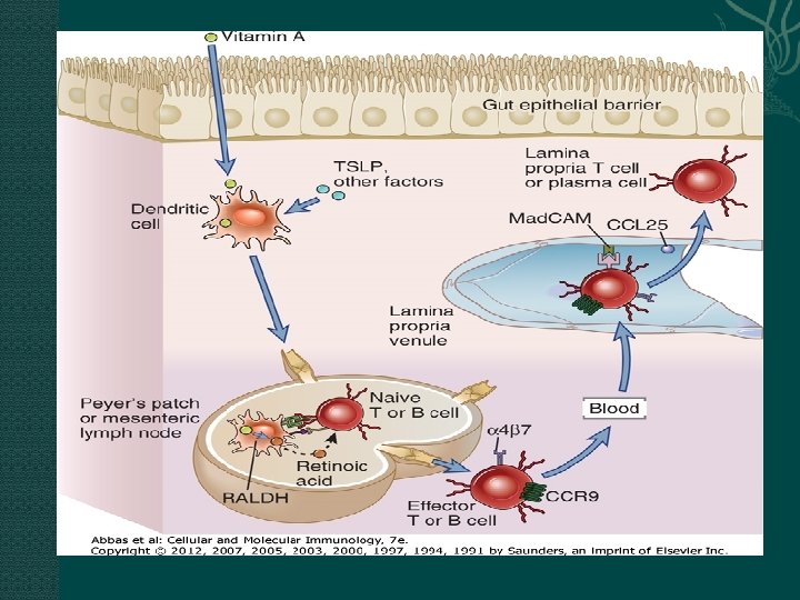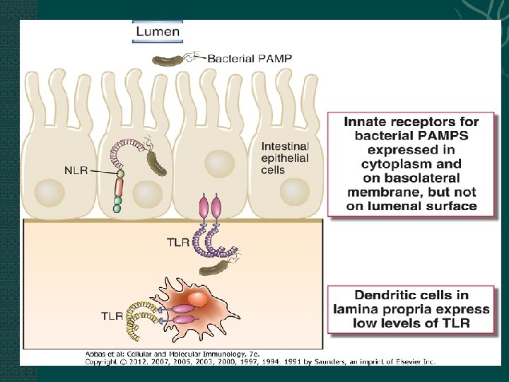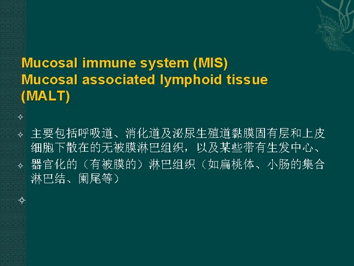 Component of gastrointestinal associated lymphoid tissue Secondary lymphoid tissue in gut wall Peyer’s patch isolated follicles (colon Appendix) Mesenteric lymph node Diffusely distributed immune cells Lamina propria lymphocyte, LPL intraepithelial lymphocyte, IEL
