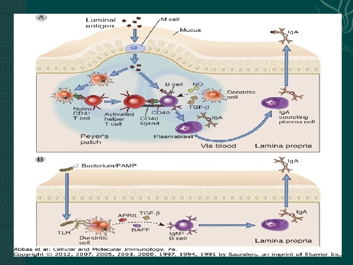 Ig. A isotype switching in B cells in GALT and mesenteric lymph nodes T-dependent mechanisms T-independent mechanisms