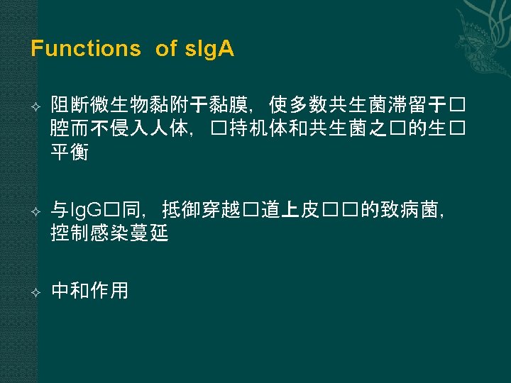 biological barrier commensal organisms 作用:阻止病原体在�道的定居 与病原体�争空�和�养 �生抗菌物�(如蛋白�毒素) TLRs and NLRs 的表达�黏膜固有免疫的影响 DCs and macrophages in the lamina propria of the gut inhibit inflammation IL-10 transforming growth factor-β (TGF-β)