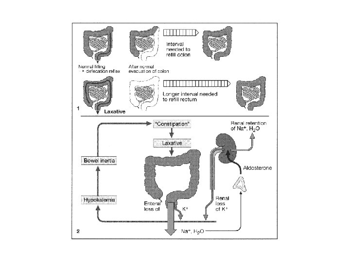 Laxative Abuse • Most common cause of constipation! • Longer interval needed to refill colon is misinterpreted as constipation => repeated use • Enteral loss of water and salts causes release of aldosterone => stimulates reabsorption in intestine, but increases renal excretion of K+ => double loss of K+ causes hypokalemia, which in turn reduces peristalsis. =>This is then often misinterpreted as constipation => repeated laxative use