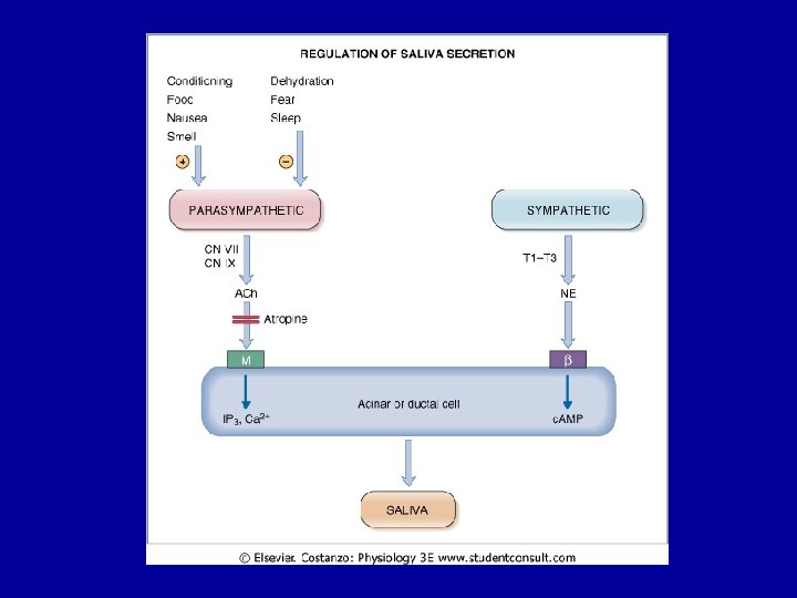 Control of Secretion • Unique aspect of control of salivary secretion Ø secretion rate depends entirely on neural control –autonomic nervous system (ANS) Ø both Parasympathetic and Sympathetic lead to increase secretion Ø Composition modified by Aldosterone: increases Na, Cl reabsoption ii. increases K secretion i.
