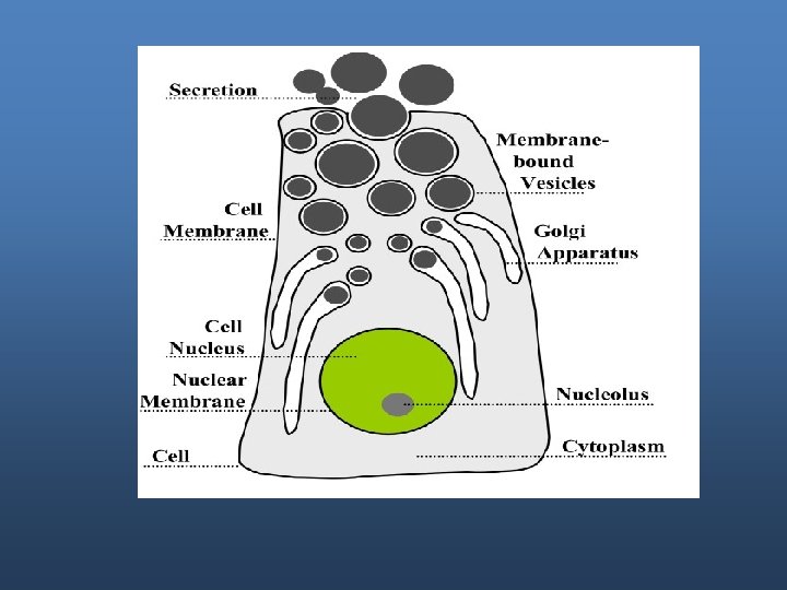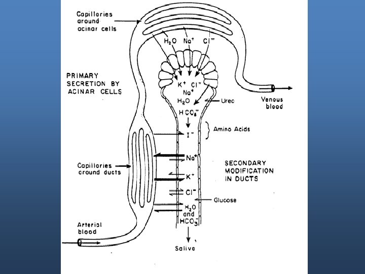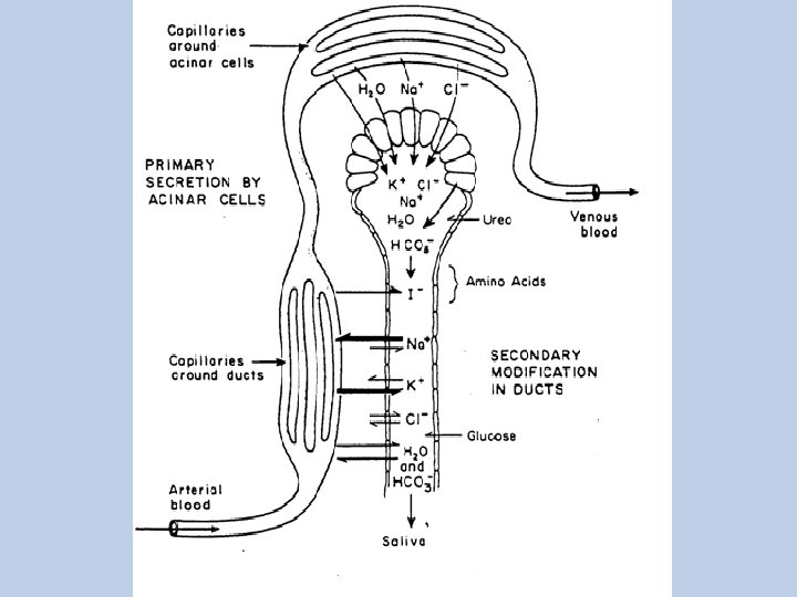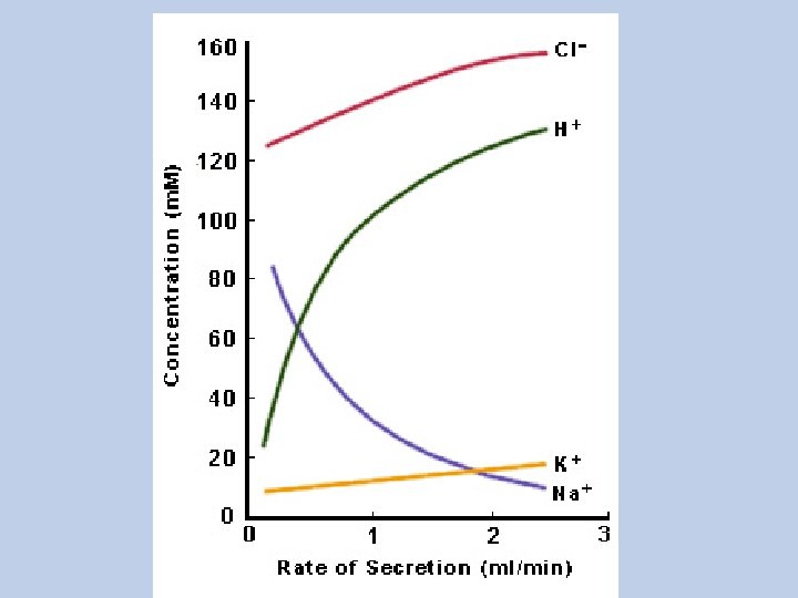 Mechanism of Secretion • • Active transport of Cl- at the basal portion of the membrane. Increase in negativity of membrane potential which attract the positive ion (Na+). Increase osmotic pressure inside the cell >> pull water inside >> increase hydrostatic pressure. This increase results in minute ruptures at the lumenal part of the membrane which causes flushing of water,