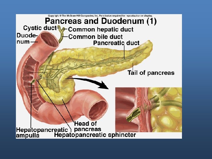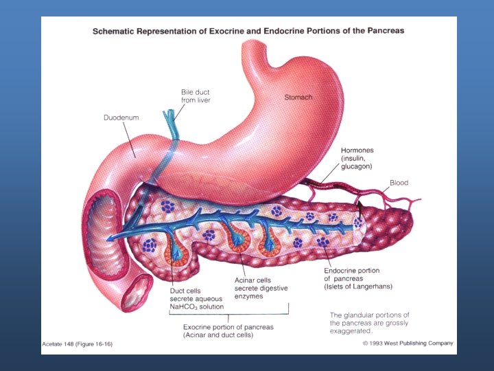 Exocrine portion - Enzymes: secreted by acinar cells. - Water and bicarbonate are secreted by duct cells.