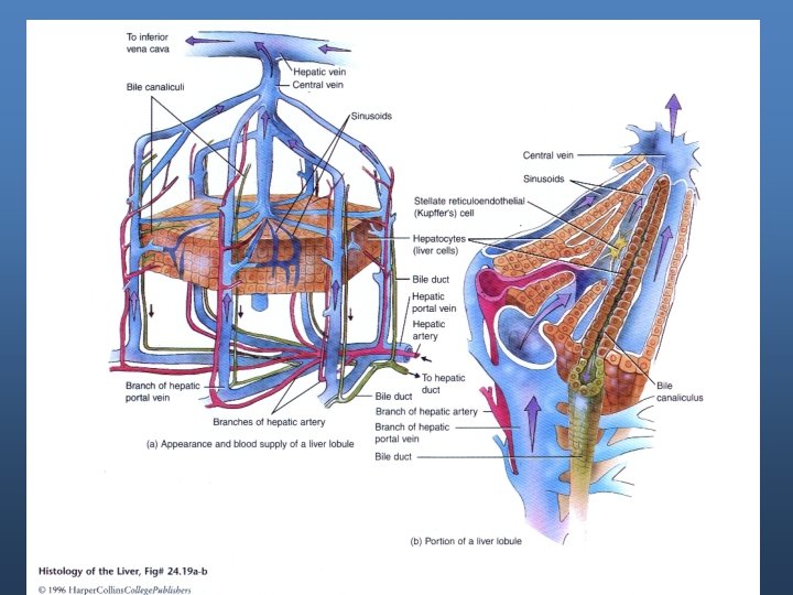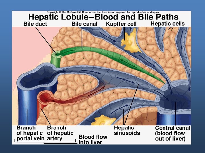 Liver functions - Metabolic processing: Process all nutrients after their absorption. - Detoxification of body wastes, hormones, drugs, and other foreign bodies. - Synthesis of plasma proteins, including clotting factors (their synthesis requires vit. K), hormone transporters. - Storage organ of glycogen, iron (ferritin), copper, and vitamines. - Removal of bacteria and foreign materials by reticuloendothelial cells (Kupffer cells). - Excretion of cholesterol and bilirubin.