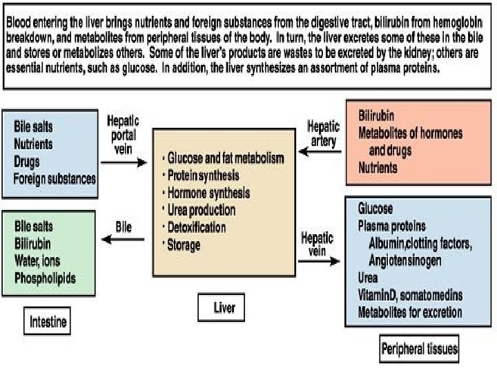 Blood flow into the liver comes from tow sources: ♦ Oxygenating blood containingmetabolites from peripheral tissues reaches the liver via the hepatic artery. ♦ Blood coming to the liver through the hepatic portal vein is rich in absorbed nutrients from the GIT, and contains haemoglobinbreakdown products from the spleen. ♦ Blood leaves liver in the hepatic vein.