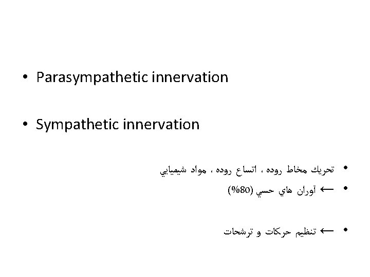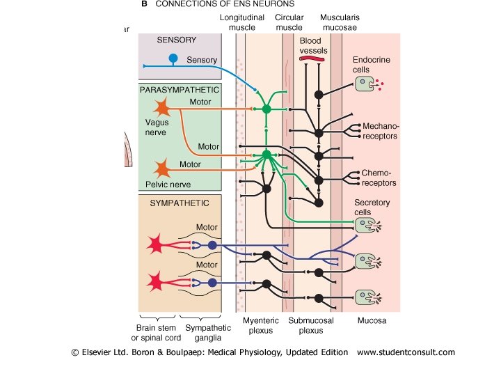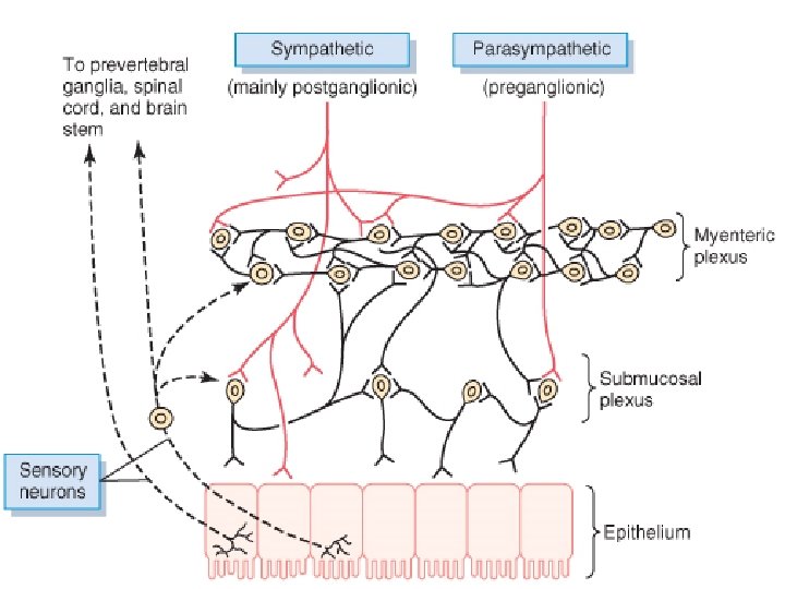 • Sensory nerve endings (Epithelium) – Mynert & meissner – GI reflexes – SC, Brain stem, Prevertebral ganglia, Vague, • • A. Ch NE, Epi 5 HT, DA, ATP, CCK, VIP, SS, Sub P, Enk, Bombesin