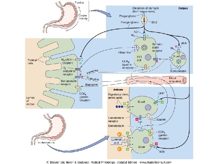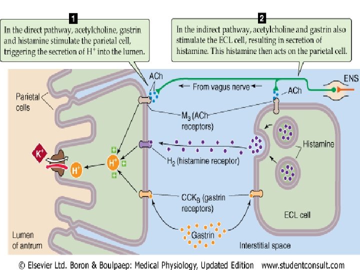 Stimulation of Hcl secretion • A. Ch • Gastrin • Histamin • Enterochromaffin-like cell (ECL) – Chyme in antrum – Gastrin