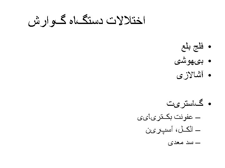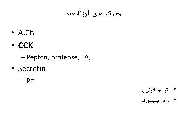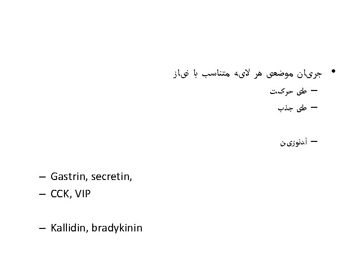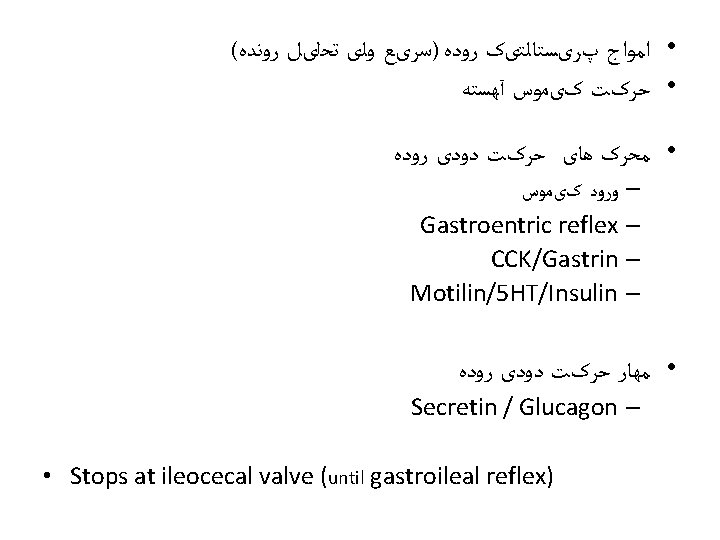 GI reflexes • ENS • ﺣﺮکﺎﺕ ﺩﻭﺩی • ﻣﺨﻠﻮﻁ کﻨﻨﺪﻩ • ﺗﺮﺷﺤﺎﺕ گﻮﺍﺭﺷی • GIT → Sympathetic Ganglia → different GIT location – Gastrocolic reflex – Enterogastric reflex – Colonoilleal reflex • GIT → Spinal cord/Brain stem → different GIT location – Defication