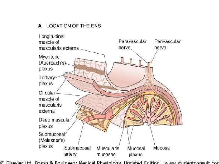 ENS • Myenteric plexus or Auerbach’s plexus – GIT motility – Tonus, rhythmic contraction, frequency, velocity of peristalsis – VIP (inhibitory) • pyloric sphincter, sphincter of the ileocecal valve • Submucosal plexus or Meissner’s plexus – Blood flow & secretion – Local secretion, absorption, – Local contraction of the submucosal muscle
