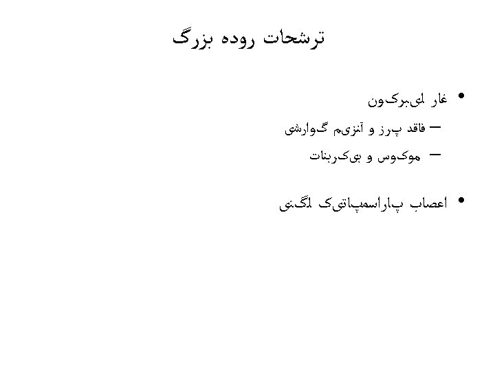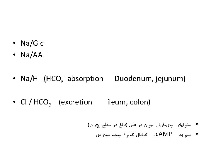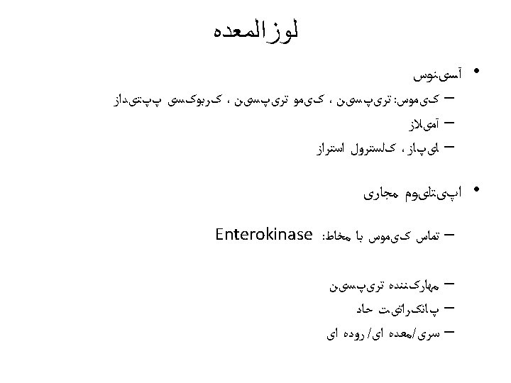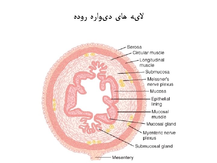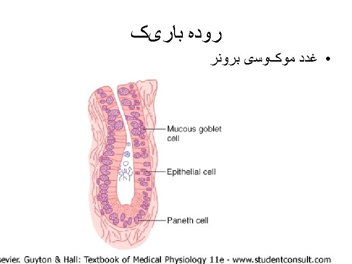 ﺗﺮﺷﺤﺎﺕ ﺭﻭﺩﻩ • Brunner glands – Vagus / Secretin – Sympathetic inhibition (Peptic Ulcer) • Lieberkuhn crypts – Goblet cells – Enterocytes • 1. 8 L/d • Digestive Enzymes