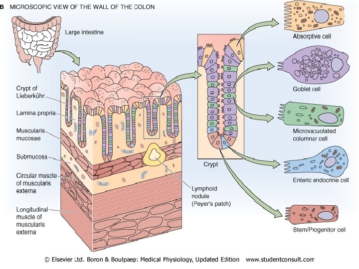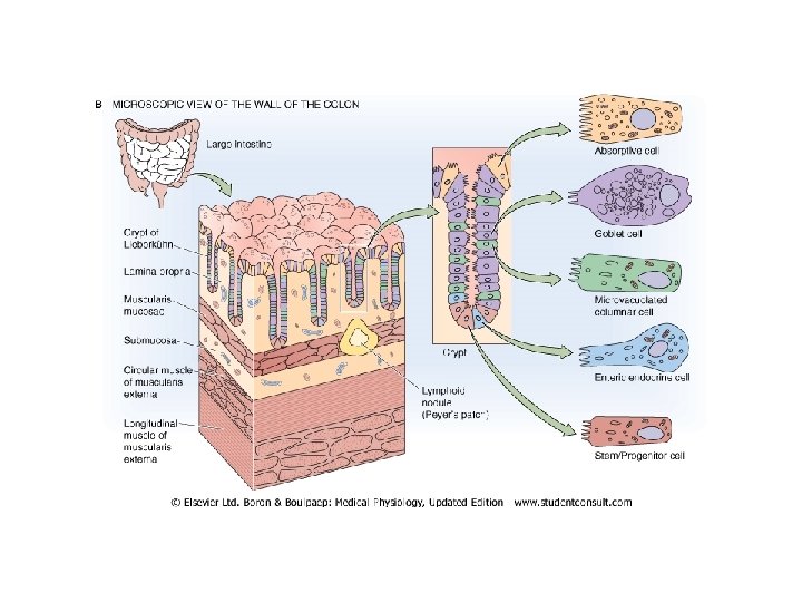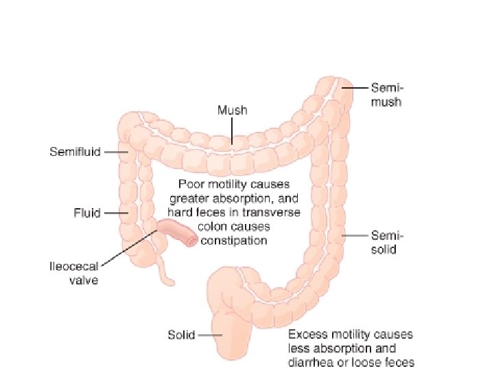 Colon • Water & electrolytes absorption • storage • Haustrations – teniae coli – 2. 5 cm • Mass Movements – 1 -3 times/day 20 cm, 10 -30 min – Gastrocolic, Duodenocolic • Ulcerative colit