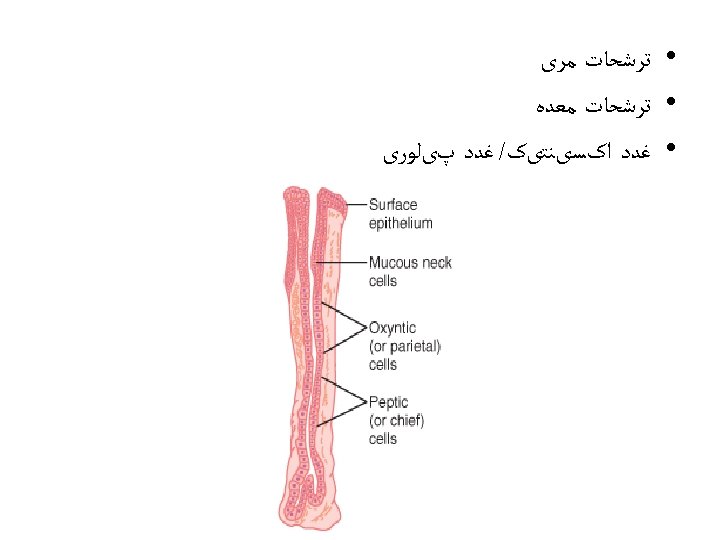 ﺗﺮﺷﺤﺎﺕ ﻣﻌﺪﻩ • Mocous neck cell • Oxyntic (Parietal) cell Hcl 160 m. M • Peptic (chief) cell • Pyloric cell Body/antrum