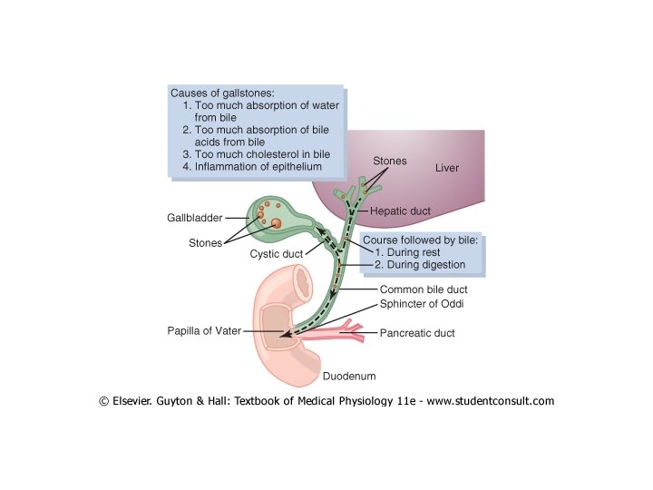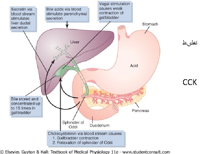 CCK • “I” cells (mucosa of the duodenum and jejunum) – FA, – Monoglyceride • Bile secretion • inhibits stomach contraction • Inhibits appetite