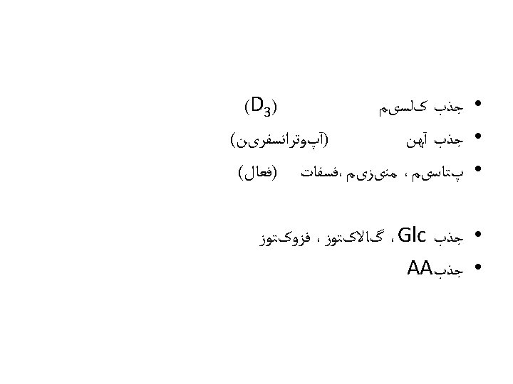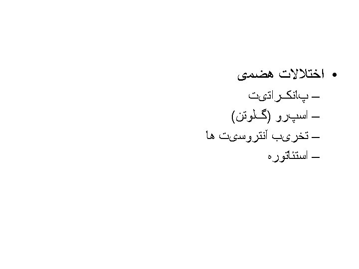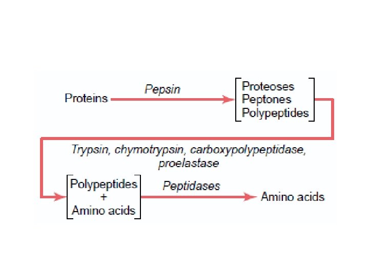 ﻫﻴﺪﺭﻭﻟﻴﺰ پﺮﻭﺗﺌﻴﻦ ﻫﺎ • Pepsin (collagen), p. H , %10 -20 • Proelatase (elastin) • Trypsin, chymotrypsin, • Carboxypeptidase • Enterocyte (aminopeptidase, Dipeptidase) • Cytosolic peptidase