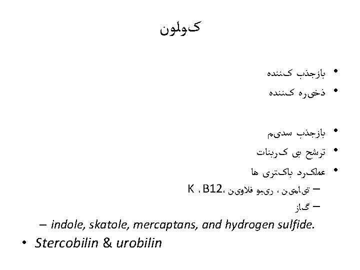 • Stercobilin, urobilin • indole, skatole, mercaptans, and hydrogen sulfide
