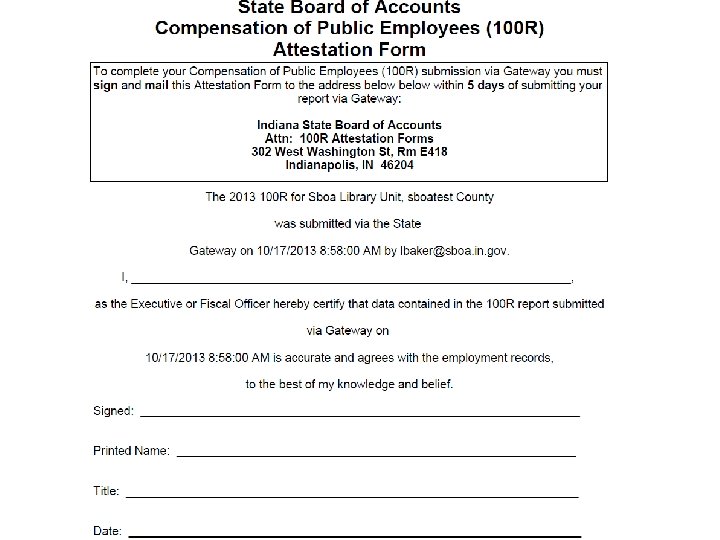 Certified Report of Names, Addresses, Duties and Compensation of Public Employees (Form 100 R) • Attestation Statement – Certifies that the data is accurate to the best of your knowledge and belief. – Must be signed by the official. – Must be mailed within 5 days of submitting on Gateway. – If you re-submit your 100 R on Gateway, you must print, sign and mail a new attestation form.