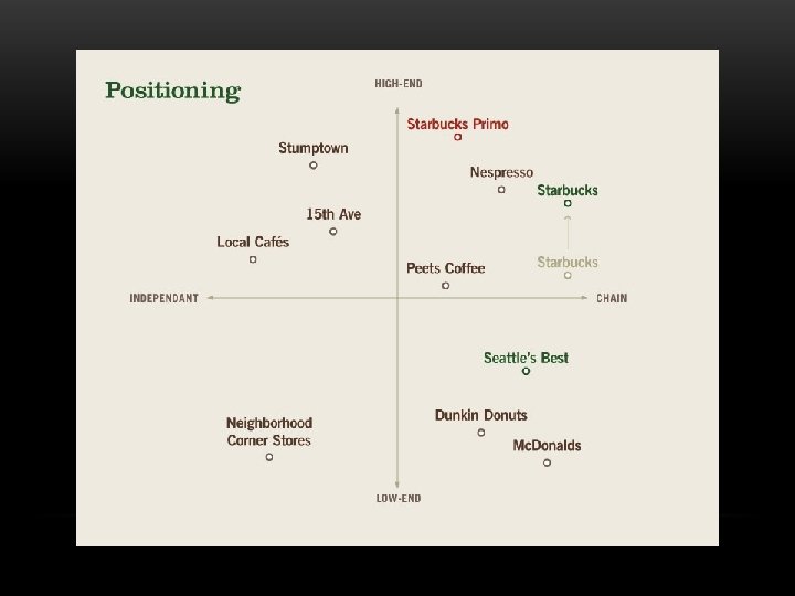 WHAT IS POSITIONING? • Creating a “perception” (or image) of what the market believes of your product • Not simply informing them about your product • The positioning concept focuses on the rational or emotional benefits that buyer will receive or feel by using the product/service the perception/image conveyed • Differentiation: what makes the product/service different than competitors? • Repositioning: shift the entire image and gauge how consumers will react