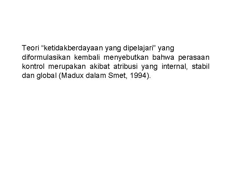 Teori “ketidakberdayaan yang dipelajari” yang diformulasikan kembali menyebutkan bahwa perasaan kontrol merupakan akibat atribusi yang internal, stabil dan global (Madux dalam Smet, 1994).