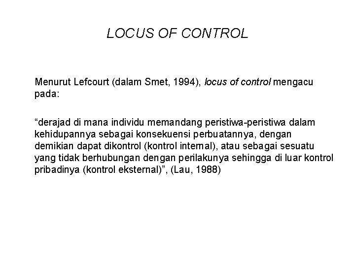 LOCUS OF CONTROL Menurut Lefcourt (dalam Smet, 1994), locus of control mengacu pada: “derajad di mana individu memandang peristiwa-peristiwa dalam kehidupannya sebagai konsekuensi perbuatannya, dengan demikian dapat dikontrol (kontrol internal), atau sebagai sesuatu yang tidak berhubungan dengan perilakunya sehingga di luar kontrol pribadinya (kontrol eksternal)”, (Lau, 1988)