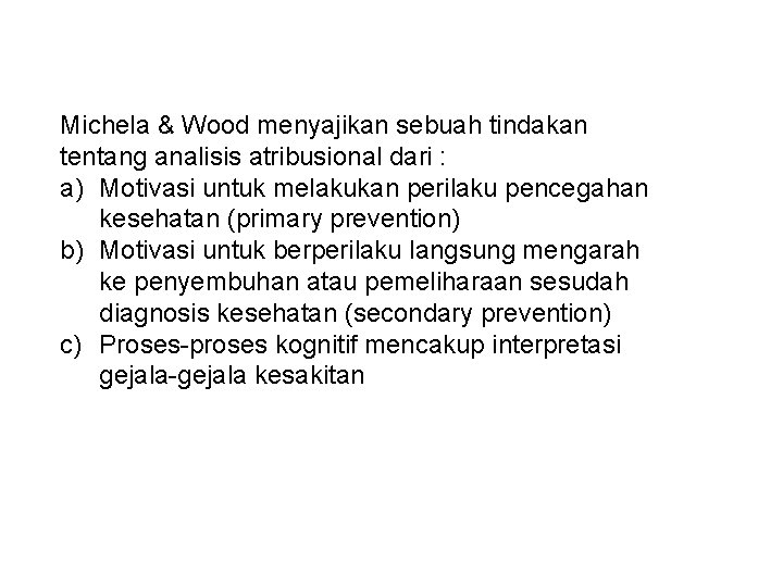 Michela & Wood menyajikan sebuah tindakan tentang analisis atribusional dari : a) Motivasi untuk melakukan perilaku pencegahan kesehatan (primary prevention) b) Motivasi untuk berperilaku langsung mengarah ke penyembuhan atau pemeliharaan sesudah diagnosis kesehatan (secondary prevention) c) Proses-proses kognitif mencakup interpretasi gejala-gejala kesakitan