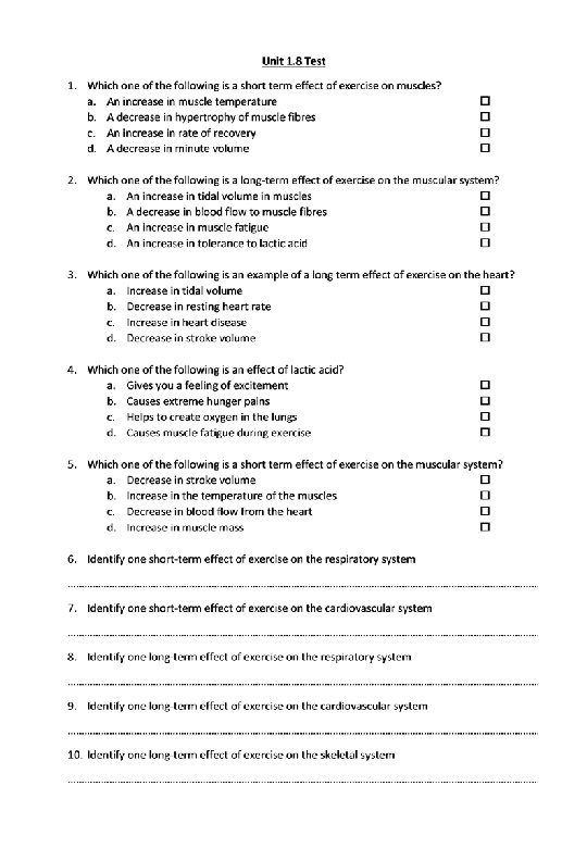 GCSE Effects of Exercise: What do I need to know? Understand the short term effects of exercise on the body systems, understand the long term effects of exercise on the body systems. Short Term Effects Effect What happens Why? Muscle Temperature HR/SV/Q Redistribution of blood TV/VE/BR Oxygen to muscles Lactic acid production Long Term Effects Effect Bone Density Muscle Hypertrophy Muscular Strength Muscular Endurance Resistance to Fatigue Rate of Recovery Aerobic Capacity Respiratory Muscles What happens Why?
