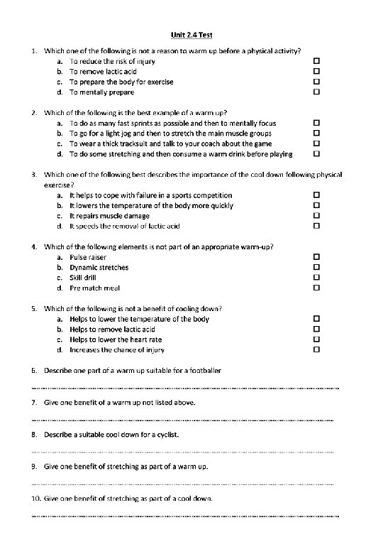 GCSE Warm Ups & Cool Downs: What do I need to know? Understand the key components of a warm up and cool down and understand the physical benefits. Warm Up Component Reason Example Pulse Raiser Mobility Stretching Dynamic Movements Skill Rehearsal Cool Down Component Low Intensity Exercise Stretching Benefits of a Warm Up Benefits of a Cool Down 1. 2. 3. 4. 5.