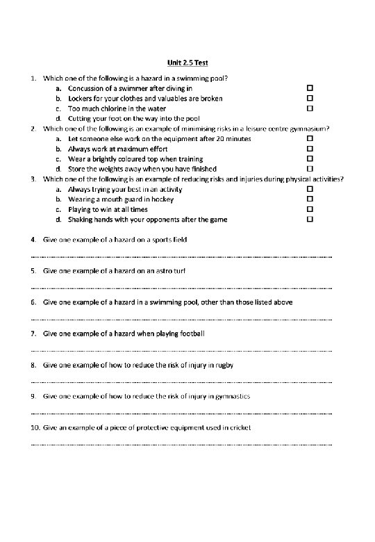 GCSE Injury Prevention: What do I need to know? Understand how the risk of injury can be reduced and know potential hazards in a range of settings. Setting Potential Hazards Sports Hall Fitness Centre Playing Fields Swimming Pool Artificial Turf Method of Reducing Risk Personal Protective Equipment Correct Clothing / Footwear Appropriate Level of Competition Lifting & Carrying Equipment Safely Use of Warm Up / Cool Down Sporting Examples