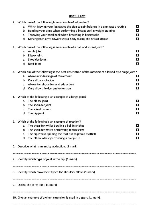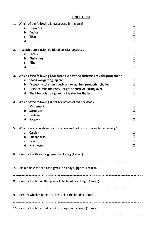 Topic The Structure and Function of the Skeletal System. The location of the 19 major bones in the body. The functions of the skeleton. The location of the hinge and ball and socket joints in the body. The types of movements possible at the joints of the body. The roles of ligaments, cartilage and tendons The Structure and Function of the Muscular System - The location of the 11 major muscles in the body. The muscles that contract to create movement at each joint. The definitions and roles of the agonist, antagonist and fixator in an antagonistic muscle action. Movement Analysis The three types of lever in the body and sporting examples of when they are used. The three planes of movement in the body. The three axes of rotation in the body. The Cardiovascular and Respiratory Systems The three types of blood vessel. The pathway of blood through the heart. The definitions of heart rate, stroke volume, cardiac output, breathing rate, tidal volume and minute ventilation. The role of red blood cells. The process of gaseous exchange and the role of alveoli. The definitions of aerobic and anaerobic exercise with sporting examples. The Effects of Exercise on the Body Systems Effects on muscular, Respiratory and muscular system. The Components of Fitness The definitions and sporting examples of the components of fitness (muscular endurance, cardiovascular endurance, speed, strength, power, flexibility, agility, balance, co-ordination and reaction time). The fitness tests for the components of fitness. The Principles of Training The definitions of the principles of training and how these are applied to increase fitness. The definitions of the elements of the FITT principle and how they can increase fitness. The methods of training and sporting examples of when these would be used. The benefits of and reasons for warming up and cooling down. Preventing Injury in Physical Activity and Training The ways to prevent injury in physical activity and sport. The potential hazards in a range of physical activity and sport settings.