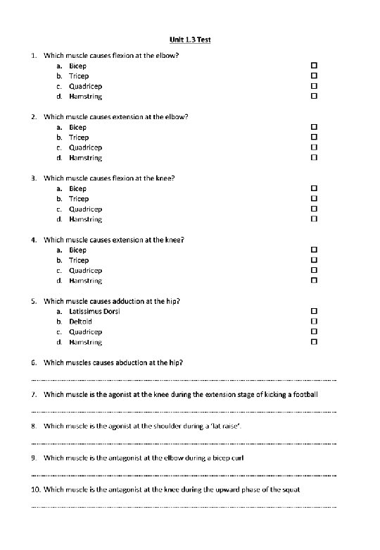 GCSE Muscular System: What do I need to know? Know the movement caused when each muscle is the agonist and give sporting examples. Muscle Bicep Tricep Quadricep Hamstring Deltoid Latissimus Dorsi Gluteals Gastrocnemius Abdominals Movement? At which joint? Sporting example