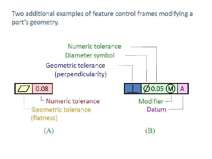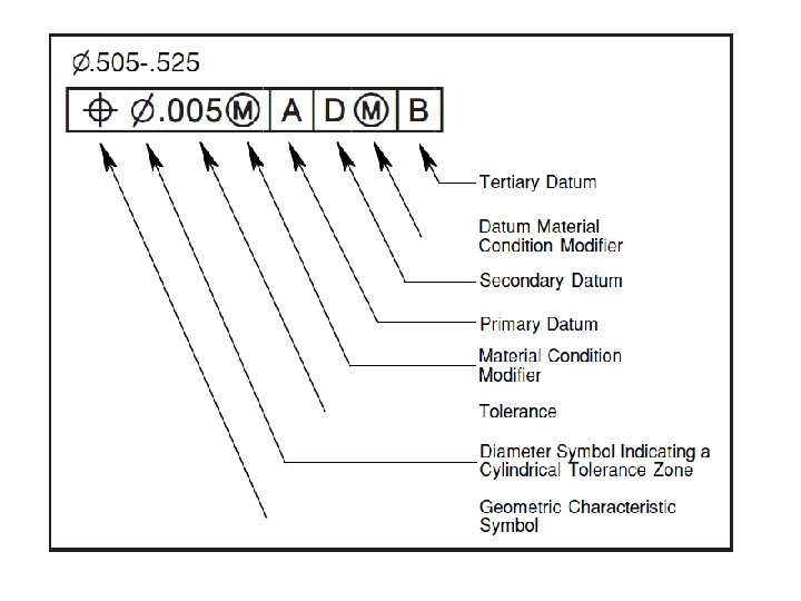 How to read? The position tolerance requires that The axis of the controlled feature Must lie within a cylindrical tolerance zone. 005 in diameter At maximum material condition (MMC) Oriented and located with basic dimensions to datum feature A at maximum material boundary (MMB)