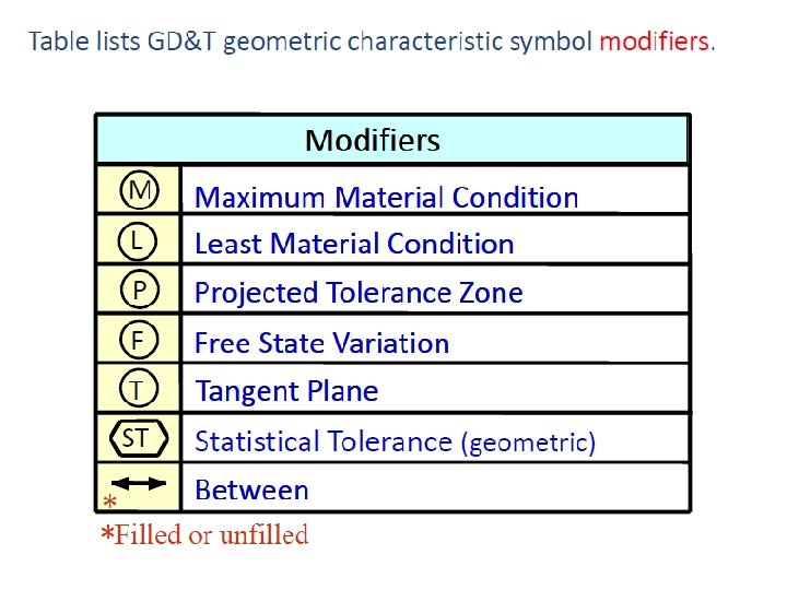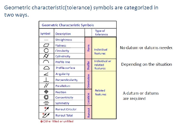 GD&T • GD&T has increased in practice in last 15 years because of ISO 9000. – ISO 9000 requires not only that something be required, but how it is to be controlled. For example, how round does a round feature have to be? • GD&T is a system that uses standard symbols to indicate tolerances that are based on the feature’s geometry. – Sometimes called feature based dimensioning & tolerancing or true position dimensioning & tolerancing • GD&T practices are specified in ANSI Y 14. 5 M-1994.