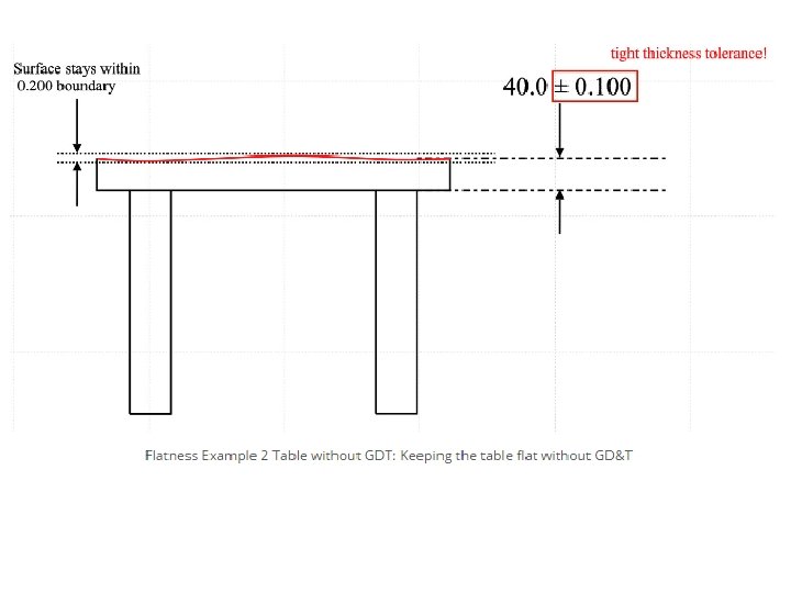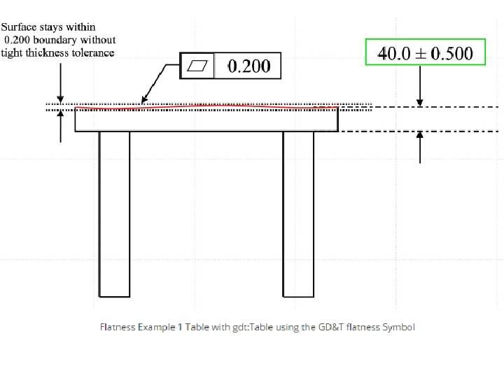 Example • If you want to make sure that a tabletop is perfectly flat, if you did not have a flatness callout, you would have to constrain the height of the table very tightly to make sure that the entire surface is straight. • With flatness, you can allow the table to be flat without constraining the tabletop thickness very tight. • (You would be rejecting tables that were good thicknesses and normally in spec if using GD&T)