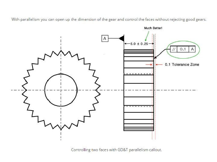 Parallelism • Parallelism is a fairly common symbol that describes a parallel orientation of one referenced feature to a datum surface or line. • Parallelism is quite simple to measure. Like flatness, a gauge is run across the reference surface or feature. However unlike flatness, the part is constrained against a granite block or flat plane that acts as the datum surface where it is measured.