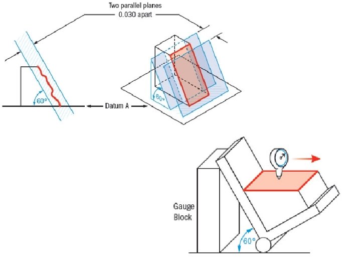 Angularity • The distance between two parallel planes, inclined at a specified basic angle in which the surface, axis, or center plane of the feature must lie. • Angularity is the symbol that describes the specific orientation of one feature to another at a referenced angle. • Two parallel planes or lines which are oriented at the specified angle in relation to a datum. All points on the referenced surface must fall into this tolerance zone. • Angularity does not directly control the angle of the referenced surface; it controls the envelope (like flatness) that the entire surface can lie. • Remember – You are not controlling the angle with angularity – you are controlling the surface to fall within the specified dimensional tolerance in millimeters!