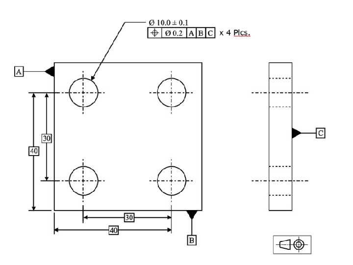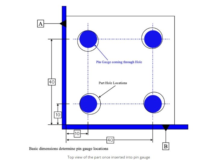 Formula for a the functional gauge to measure the true position of all holes: Individual Pin Diameters = Min hole Ø -True position tolerance This example Pin Ø = 9. 9 – 0. 2 = Ø 9. 7 Location of pins: Same specifications