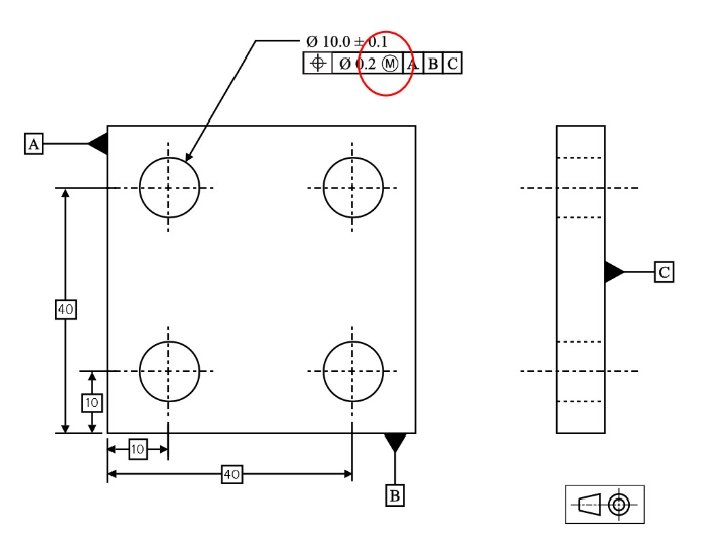 1. MMC(Maximum material condition) M Maximum Material Condition (MMC) a condition in which the feature contains the maximum amount of material relative to the associated tolerances. Examples are maximum shaft diameter and minimum hole diameter. Examples: • Largest pin diameter (Largest shaft) • Smallest hole size. (smallest hole)