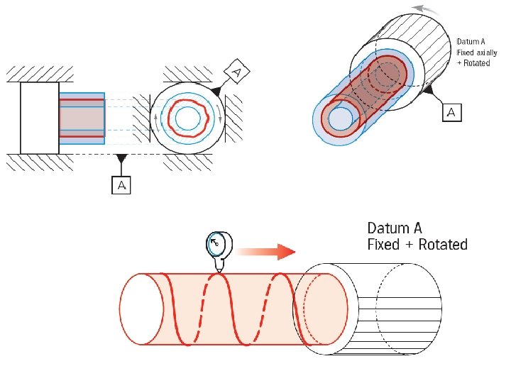 • An axle is normally under high stress and needs to fit evenly in a bushing (not shown). If the referenced surface does not make even, stable contact with the housing bushings the axle will wear unevenly leading to eventual failure. • Surface ‘A’(datum) is controlled with a roller bearing and should be axially aligned with the reference surface. Total Runout is called in the same way as Runout