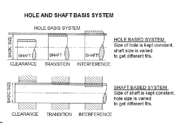 Important terms 8. Hole Basis System: - Where the size of the hole is kept constant and the size of the shaft is varied to get the different class of fits, then it is known as the hole basis system. 9. Shaft Basis System: - Where the size of the shaft is kept constant and the variations given to the hole to get the different class of fits, then it is known as the shaft basis system.