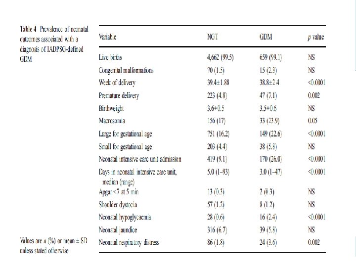 Metabolic syndrome components (ATP-III) at follow-up (mean 2. 6 years) Prevalence (%) 100 54. 7 50 GDM by IADPSG criteria 38. 9 NGT by IADPSG criteria 32. 5 31. 2 20. 4 15. 6 15. 1 14. 8 6. 1 1. 9 0 Waist circumference BP HDL Triglycerides Fasting glucose
